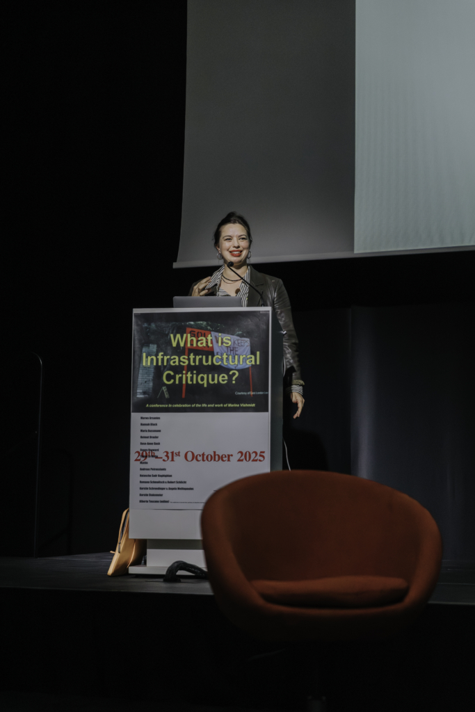 The conference What is Infrastructural Critique? – in memory of Marina Vishmidt featured artists, critical theorists and collaborators with Marina, who came together to think through her concepts and relate them to their own work and artistic practices. Themes of discussion included: infrastructural critique and ecology, infrastructural critique vs. institutional critique, art and political economy, art and logistics, the politics of abolition in contemporary art, infrastructural critique and music and the relationship of infrastructure to race.