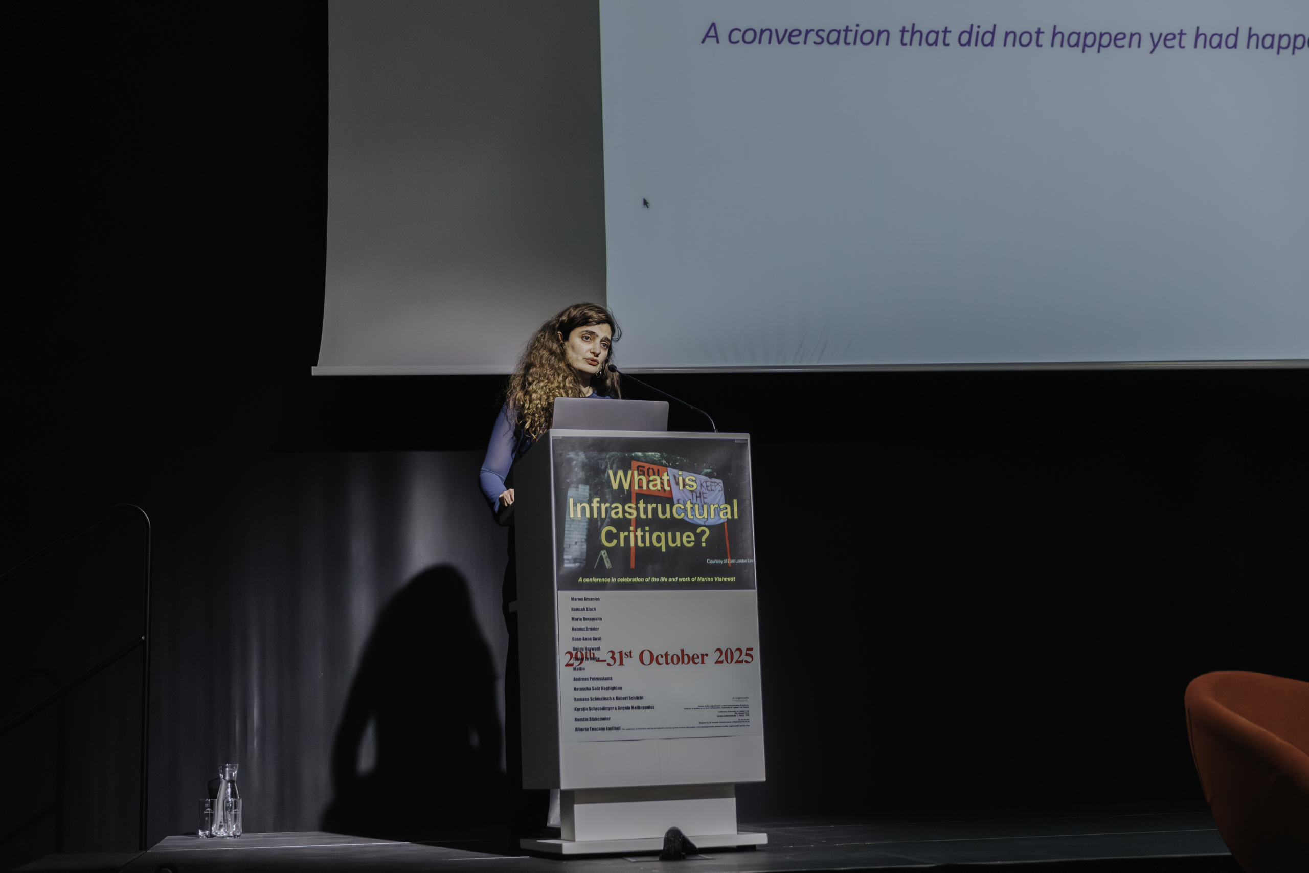 The discussion took place over three days from the evening of 29 to 31 October 2025. The event began with a talk on the forthcoming book Infrastructural Critique: Contemporary Art Between Reproduction and Abolition, forthcoming with Verso in 2026.
