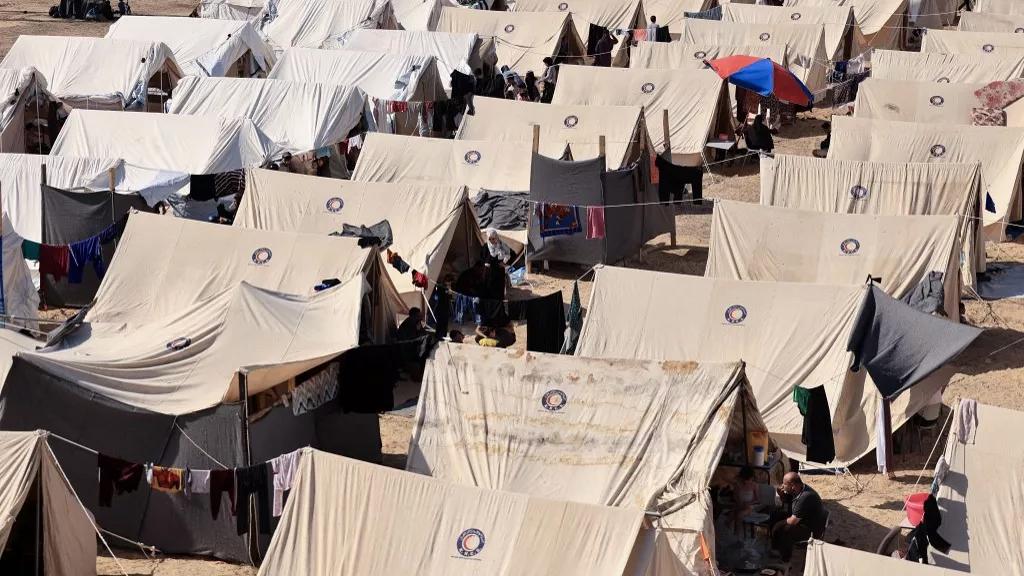 A camp run by the United Nations Relief Works Agency in Khan Younis, in southern Gaza, for Palestinians displaced from Gaza City. Samar Abu Elouf for The New York Times